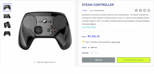 Ang presyo ng Steam Controller ay hindi pa pormal na inanunsyo ngunit ang mga preorder ay nakataas na sa ecommerce store ng Datablitz sa halagang PHP 3,395. Ang produkto ay may ganitong paglalarawan din: